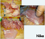 Кожу с филе снять. Каждый кусочек отбить через плёнку, чтобы мясо не разлеталось по сторонам.