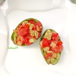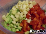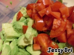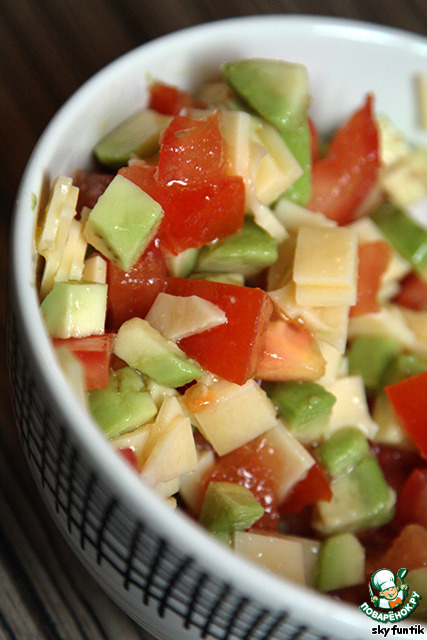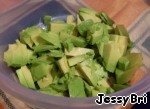 Нарезаем авокадо кубиками и сразу сбрызгиваем (а я просто полила) лимонным соком.