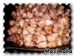 Мяско, нарезанное кубиками 1,5-2 см, поджариваем на сильном огне в оливковом масле до золотистой корочки, слегка поперчим.