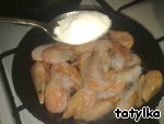 В это время в другую раскаленную сковороду наливаем немного подсолнечного масла и, разогрев его, сразу высыпаем вторую часть замороженных креветок.