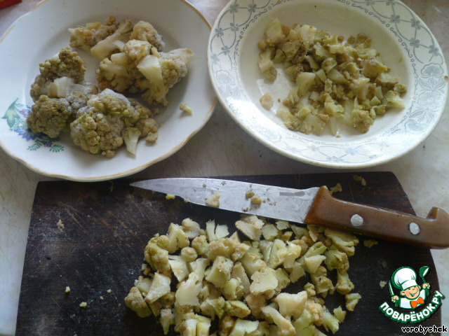 Заранее отваренную в подсоленной воде цветную капусту режем на не очень мелкие кусочки.