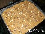 Противень застелить пергаментной бумагой, смазать маслом, вылить смесь. Осторожно распределить по всей поверхности лопаточкой. Шоколадку и оставшиеся орехи порубить ножом и выложить поверх смеси.
