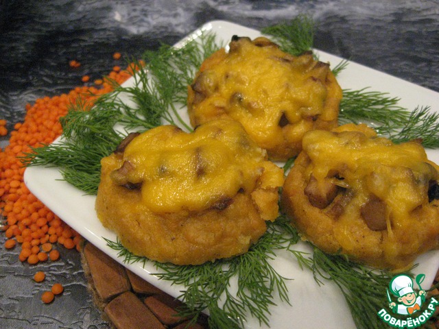 Чечевицу отварить без соли при слабом непрерывном кипении под крышкой, в воду при варке опустить вымытые и очищенные корешки сельдерея и петрушки. Красная чечевица варится 15 -20 мин. Пока чечевица варится, готовим начинку. Отваренные грибы мелко нарезать. Лук мелко покрошить. Растопить масло (25 г) на сковороде и обжарить лук с грибами. Посолить, поперчить. Воду с чечевицы слить (не торопитесь, лучше дать хорошенько стечь воде) и в горячем виде протереть через сито, можно вместе с корешками. К полученному пюре добавить соль, перец, сырые желтки и хорошо перемешать. Масса получится не густая. Массу выдавить через кондитерский шприц или мешок на противень, выстеленый пергаментом, в виде корзиночки или кольцом. В середину "корзиночки" (кольца) выложить грибную начинку. Сыр натереть на терке и присыпать им изделия. Оставшееся сливочное масло растопить и полить им "корзиночки". Выпекать при Т=220 до румянной корочки. Желательно не более 15 - 20 мин. , иначе пюре будет сухим. Подавать "корзинки" горячими со сметаной. Приятного аппетита!!!