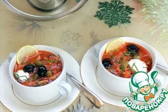 Разливаем солянку по тарелочкам, добавляя сметану, зелень, маслины и лимончик!