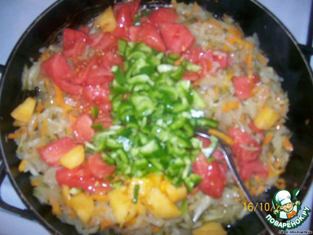 Помидоры очистить от шкурки и измельчить. Добавить перец и помидоры в обжарку.