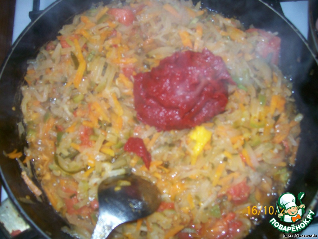 Туда же добавляем нашу овощную обжарку и колбасную обжарку.