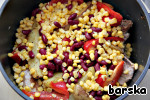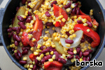 Добавить паприку, нарезанную крупными дольками и обжарить пару минут вместе. Приправить солью, перцем, майораном (по желанию можно добавить 1 красный перец чили, очищенный от семян и нарезанный тонкими полукольцами).