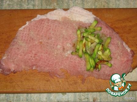 Выложить на кусок отбитого мяса немного лука и кабачков.