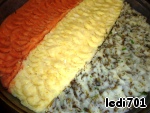 Форму смазываем растительным маслом и выкладываем частями (разноцветными) картофельное пюре. Для выкладки можно использовать кондитерский шприц. Затем форму с пюре ставим в духовку минут на 10, до подрумянивания.