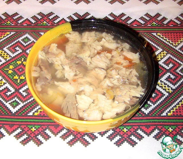 Затем бульон снимаем с огня и процеживаем. Рыбу слегка охладить (чтобы удобнее ее было разбирать руками), отделить от костей и порезать (я просто поломала) на небольшие кусочки. Но не надо крошить слишком мелко - кусочки должны быть в супе видны.