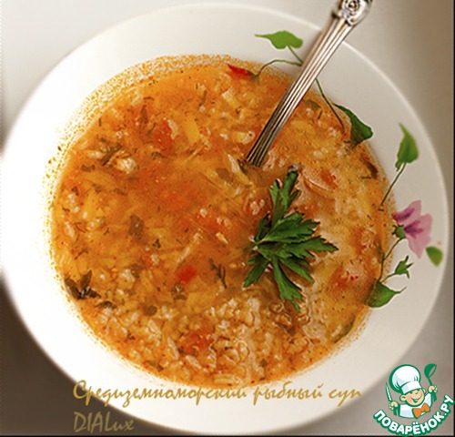 Наш средиземноморский рыбный суп готов. Разливаем по тарелкам, украшаем листиком петрушки и наслаждаемся вкусом средиземноморской кухни.