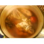 Добавляем туда же петрушку, лавровый лист, сельдерей и 2 зубчика чеснока. Наливаем воду и ставим вариться на 30-35 минут, без крышки, периодически снимая пену. По рецепту воды надо 2 л., но у меня в конце получался с таким количеством воды не суп, а каша, поэтому я доливала воду и советую ее количество удвоить и налить 4 л.