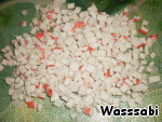 Крабовое мясо нарезать кубиками.
