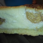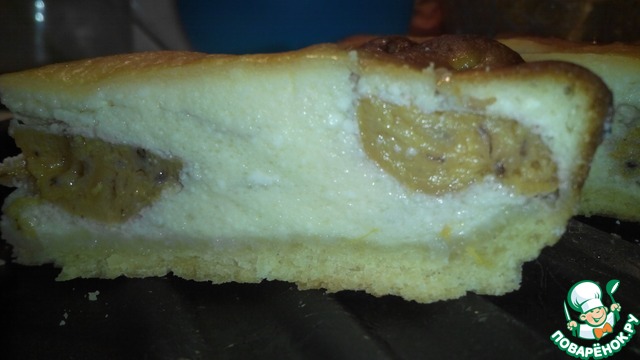 Выливаем на тесто часть начинки. Оставляем начинки столько, чтобы хватило залить хурму - примерно половина или 1/3 от творожной массы.
