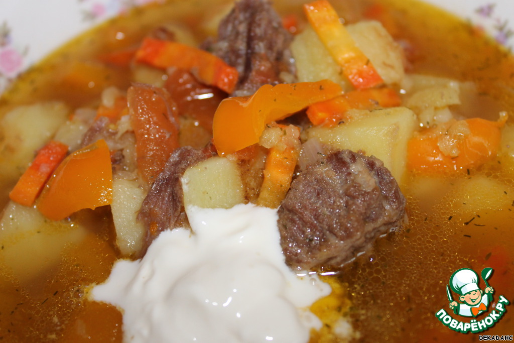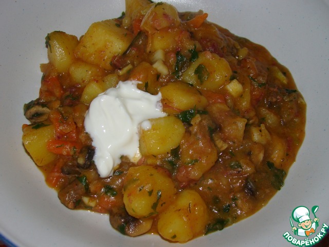 [+4]Готовила все в одном казанке: на жире, которого было в избытке в моей банке я обжарила сначала картофель, потом добавила лук, морковь и сладкий перец, "мясо" из этой банки (в очередной раз убедилась, что покупать магазинную тушенку - выбросить "деньги на ветер"), специи, грибы-шампиньоны, залила водичкой и протушила. Томатов не было, сметану добавляла порционно, по желанию.