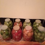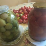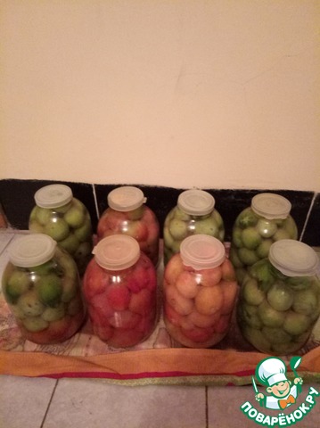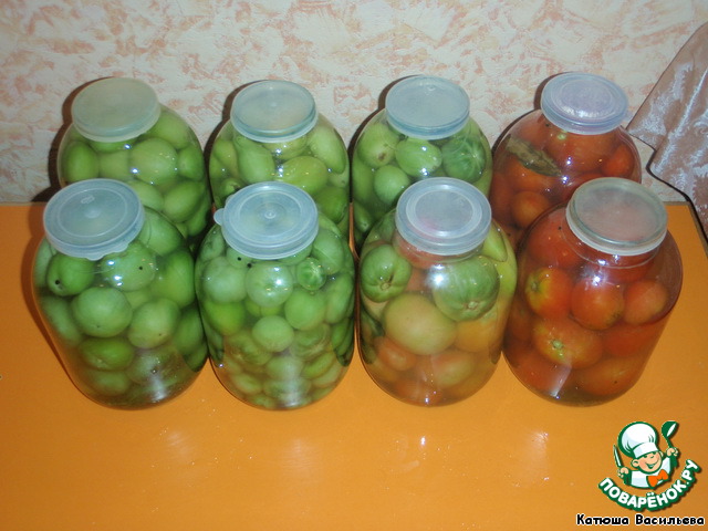 Сразу оговорюсь по поводу маринада. В рецепте маринад рассчитан на 9 л. воды, на 8 бутыльков. Но так получается не всегда. Всё зависит от размера помидоров, и от того, как плотно вы их уложите в бутыля. Мне в этот раз понадобилось 12 л. маринада, поскольку помидоры уже последние, добавлять в бутыльки было нечего, пришлось добавлять больше маринада.
