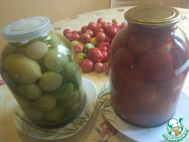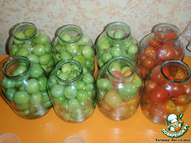 Помидоры вымыть, разложить по бутылям. Можно использовать красные, бурые, зелёные - главное не смешивать их в одном бутыльке. Я ещё сортирую по размеру, если необходимо. Очень крупные режу на 4 части.
