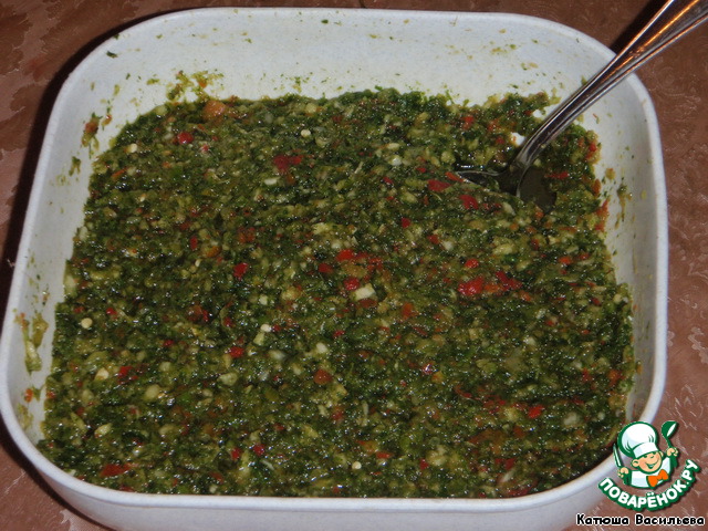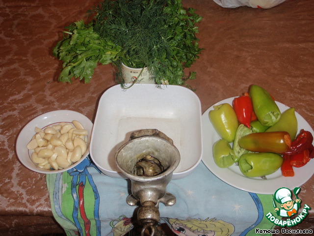 Зелень, перец горький, перец сладкий вымыть. Чеснок почистить. Всё перекрутить через мясорубку.