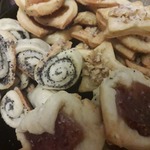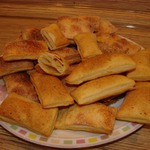 Испекла сегодня четыре вида: с маком/сахаром, грецкими орехами/сахаром, малиновым и клубничным джемом.