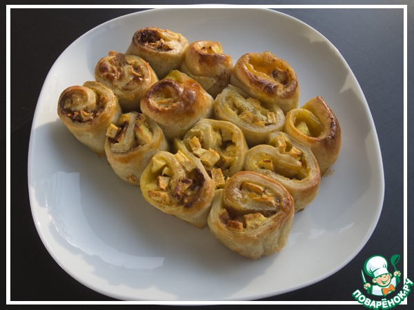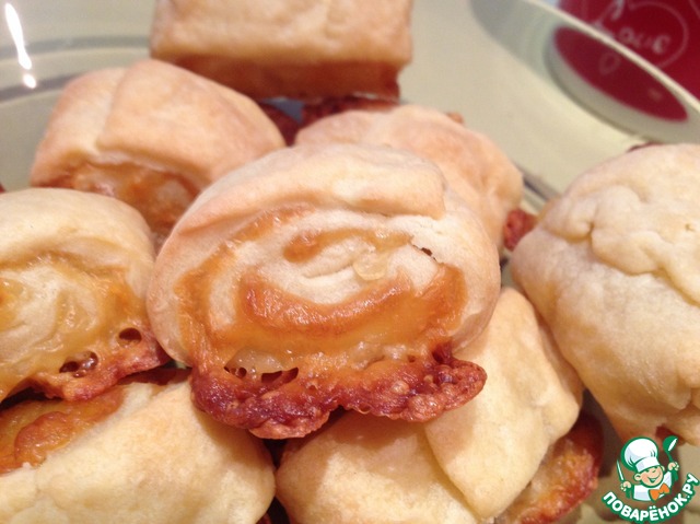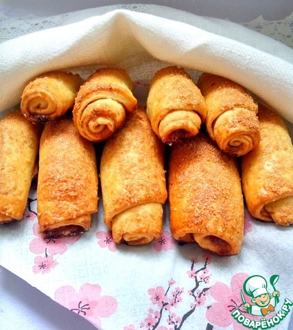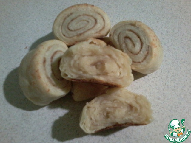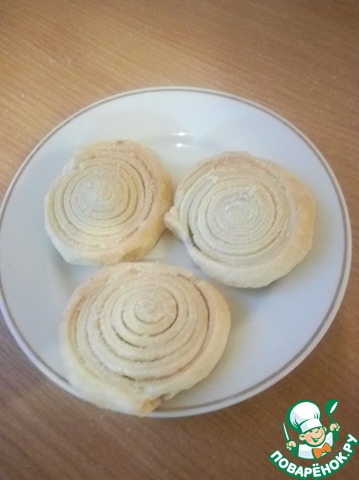 Тесто раскатать, посыпать сахаром с корицей, свернуть в рулет, нарезать на кусочки.