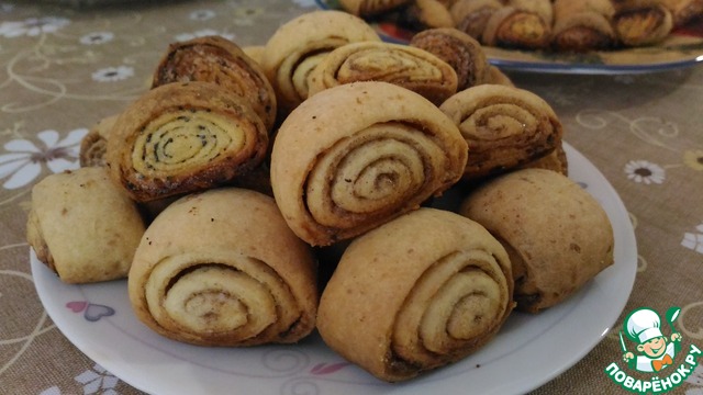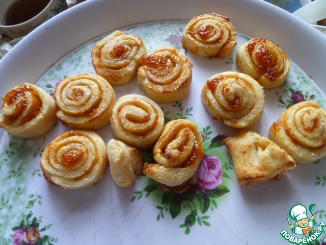 Вариант второй, усложнённый. Тесто достать их холодильника. Раскатать тонко на сильно посыпанном мукой столе, посыпать мукой сверху, свернуть в рулет, отправить в холодильник на 1 час. Далее раскатываем, формуем и печём.