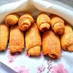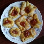 Далее самое интересное. Начнём с простого. Например, вы сделали тесто с вечера. Утром достали, отщипнули кусочки (раскатали и нарезали на полоски) величиною с грецкий орех скатали, положили на противень и в духовку на 10-15 минут при 200 гр. и у вас готовы нежнейшие, хрустящие слойки на завтрак. Во время выпечки тесто подсядет и будет эдакая плюшка. Мажьте вареньем, ореховой или шоколадной пастой или сыром, икрой, песто…. На ваш вкус. Такое тесто смело можно хранить в холодильнике неделю и пользоваться по мере надобности.