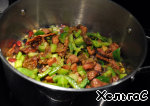 В замоченные бобовые добавить поджаренное мясо, красный перец и лавровый лист, а также добавить нарезанную зелень, залить кипятком -