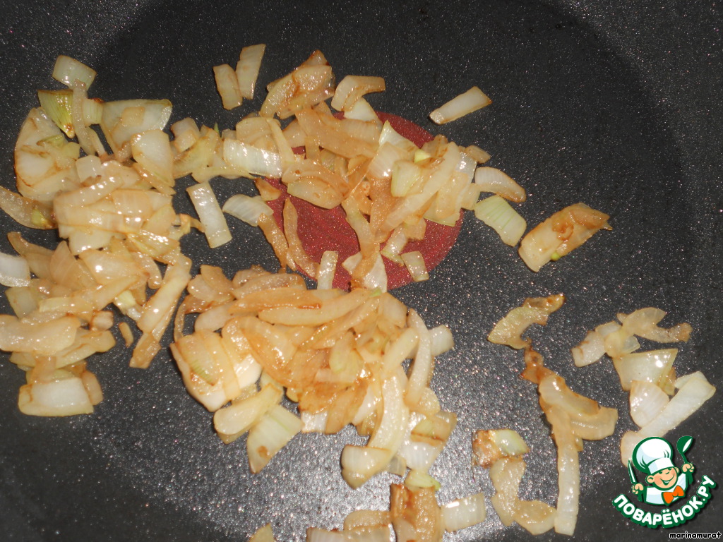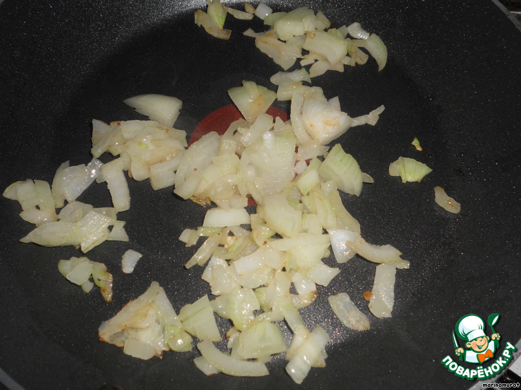 Лук мелко режем. В сковороде разогреваем 1 ст. л. растительного масла и жарим лук 3 минуты.