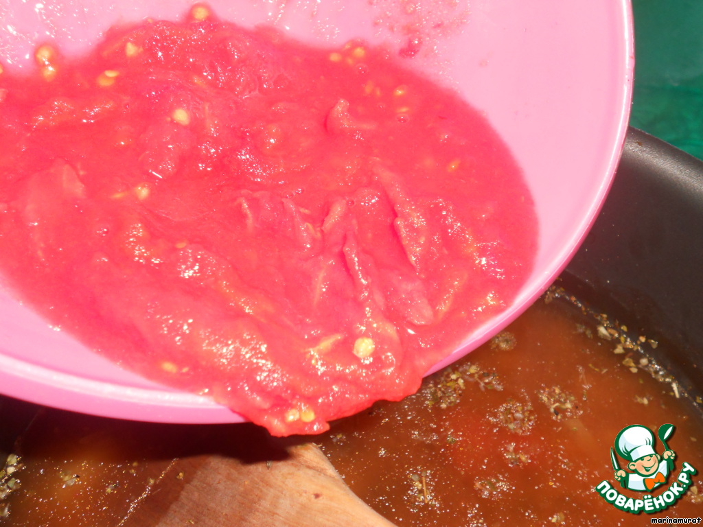 Ложку пасты растворяем в кипятке, добавляем туда орегано, соль и перец по вкусу. В отдельной посуде расчленяем 1-2 помидора, предварительно запеченых в духовке при 250 градусах 15 минут. Можно в блендере пюрировать, но мне нравится, когда кусочки помидора попадаются. Добавляем к соусу. Туда отправляем лук. Ставим на огонь и доводим до кипения.