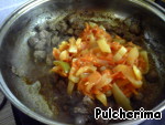 К сердечкам добавить соевый соус, через 2 - 3 минутки добавить лечо. У меня было домашнего изготовления: морковь, сладкий болгарский перец, томаты, растительное масло, специи. Если покупное - не страшно, главное без большого количества "глютаматов" и специй - чтобы вкус не перебить. Если и этого нет - просто отдельно потушите эти овощи и добавьте к сердечкам с печенкой. Туда же 1 - 2 столовых ложки томатной пасты. Перемешать, потушить 2 минутки.