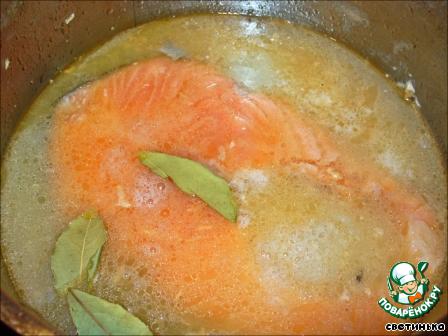 Продолжаем варить на среднем огне без крышки еще минут 30-40. Для того, чтобы осветлить бульон, слегка взбиваем белок с щепоткой соли. Затем вынимаем рыбные кости. Кладем в кастрюлю стейк, лавровый лист, взбитый белок, солим, перемешиваем и варим еще 10 минут.