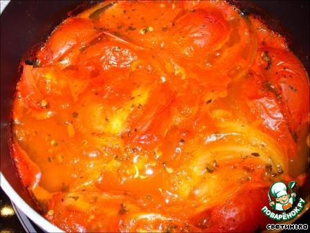 Готовим томатное желе. Помидоры режем на 4 части, лук - крупными кольцами, чеснок – мелко. Заливаем рыбным бульоном, добавляем томатную пасту, травки, соль, перец и тушим минут 20, пока они не разварятся.