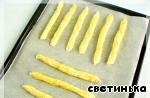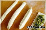 Раскатываем слоеное тесто раза в полтора и делим на полоски 5х10 см. Выкладываем на них сырно-ореховую смесь. Защипываем и прокатываем несколько раз. А теперь перекручиваем полоски, как видите, они увеличились в размерах.