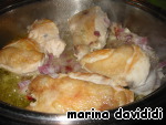 Разогреваем оливковое масло и поджариваем до корочки с одной стороны кусочки курицы. Переворачиваем на другую сторону. Добавляем мелко нарезанный лук. Тушим до приобретения цвета у лука