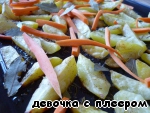 Морковь почистить и нарезать крупной соломкой. Добавить морковь к картофелю вместе с лавровым листом. Запекать еще 25 минут, периодически помешивая.