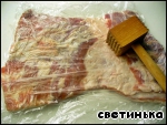 Количество жировой прослоечки полностью на Ваше усмотрение, лишнее можете срезать. У нас холодина, и лишнее сальцо сАвсем НЕлишнее, пусть остается для сугреву организма. Вымытую и обсушенную брюшину аккуратно отбейте под пищевой пленкой. Ну, так, слегонца, чтоб площадь выровнялась.