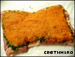 Теперь нужно сдобрить брюшину солью, перцем и аджичкой. Ровным слоем распределите по получившейся площади мясца сначала зелень, а затем курагу.