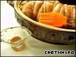 Уверенной рукой аккуратно сверните мясо рулетом и перевяжите кулинарной нитью (ну, если она у Вас есть, а если нет, то и простая сойдет). Начинка, наверняка, будет рваться наружу, не обращайте внимания. Эти кулинарные издержки производства не должны отвлекать Вас от главной цели. Для глазури смешайте коньяк и мед. Обмажьте рулет и выложите в форму швом вниз. Запекайте в разогретой до 200 градусов духовке 1 час.