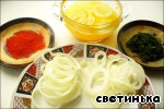 Измельчите укроп. Выньте лук из маринада и разделите на 3 части. Одну часть обваляйте в измельченном укропе, вторую – в паприке. Оставшиеся кольца верните на 10 минут в маринад, добавив в него куркуму. Ну, вот, луковый светофорчик готов к употреблению!