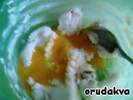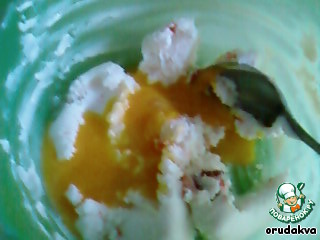 Далее я взяла сырки творожные с вишней и смешала с оставшимися 2 желтками (сахар не нужен, т.к. сырки уже сладкие!).