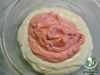 Перемешала ложкой для получения мраморности. На будущее, выкладывать лучше по принципу выкладывания теста для торта «Зебра», т.е. по 1 ст. ложке теста разного цвета в середину формы, каждый цвет в центр предыдущего. Верх выравниваем.