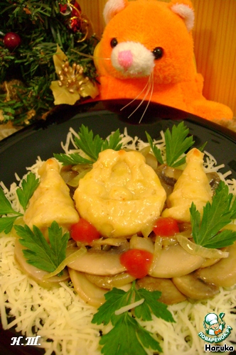 Выложил на тарелку "подушку" из сыра и обжаренных грибов с луком, сверху положил клецки, украсил и пригласил Тепу к столу.