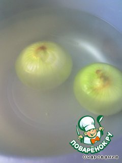 Лук крупный, очищенный залить горячей водой на 5 минут.