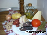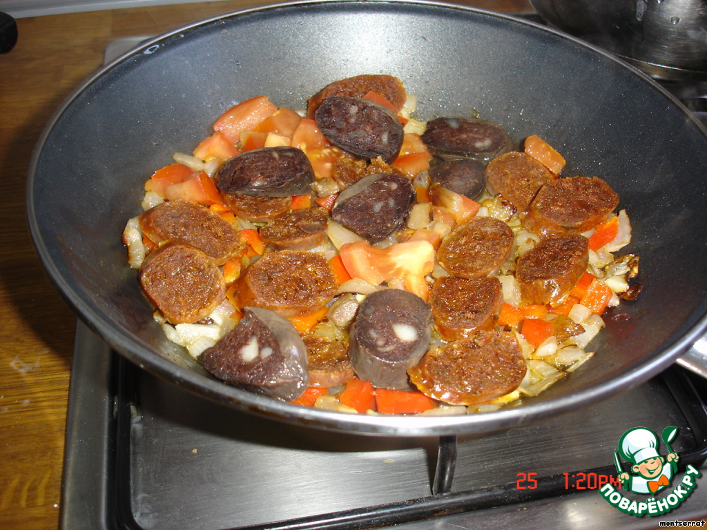 Горох замочить на ночь, сварить в горячей воде, отварить рис. Приготовить фарш: сало обжарить, добавить лук, красный перец, помидоры, обжарить до готовности, колбасу и кровянку, томатный соус добавить к готовым овощам, картофель пожарить отдельно, соединить с отварным горохом и овошами.