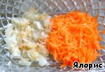 И хозяйка почистила пару картофелин, луковицу и большую морковь. Все измельчила, подрумянила лук в масле и положила в кастрюлю. -