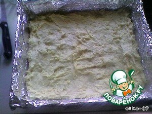 Форму (20 на 30 см) выстелить фольгой, смазать растительным маслом и выложить тесто. Распределить равномерно по всей форме и поставить выпекать в разогретую до 200 градусов духовку на 25 минут.