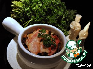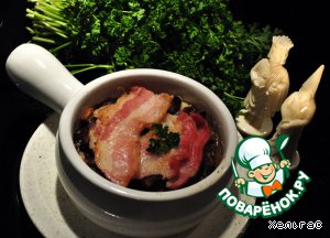 Разложить фасоль по порционным горшочкам, так, чтобы мяса кусочки были внизу, потом фасоль, и сверху накрыть беконом
