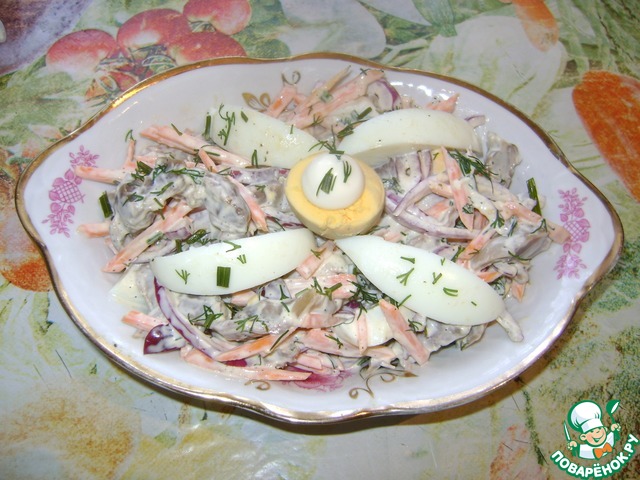 и без яиц. Заправляли майонезом. Вот ваш рецепт заинтересовал, как раз на днях у мужа ДР, и лоточек желудков как раз кстати. Даже на пробу сделаю небольшое количество и сравню.
