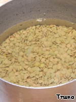 Чечевицу промыла и пересыпала в кастрюльку, залила холодной водой так, чтобы она полностью покрыла чечевицу, довела до кипения и сразу откинула на дуршлаг.