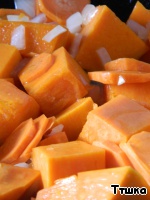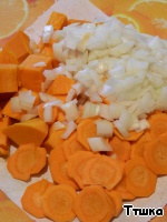А в это время почистила и нарезала тыкву (кубиками, довольно крупными), морковь (кружками) и лук (кубиками). Так же и чеснок измельчила. -